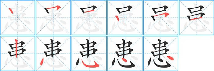 - 问:写"患"字第9笔是什么笔画?答:斜钩【