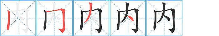 1. 里面,与“外”相对:内部。内外。内定。内地。内阁。内行(háng )。内涵。