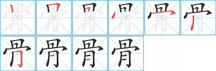 1. 人和脊椎动物体内支持身体、保护内脏的坚硬组织:骨头。骨骼(全身骨头的总称)。骨节。骨肉(a.指最亲近的有血统关系的人,亦称“骨血”;b.喻紧密相连,不可分割的关系)。骨干(gàn)。