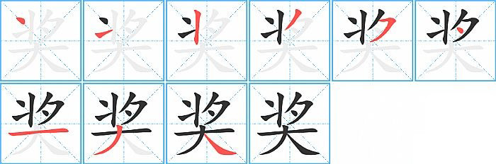 - 问:写"奖"字第9笔是什么笔画?答:捺【