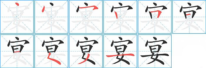 - 问:写"宴"字第10笔是什么笔画?答:横【