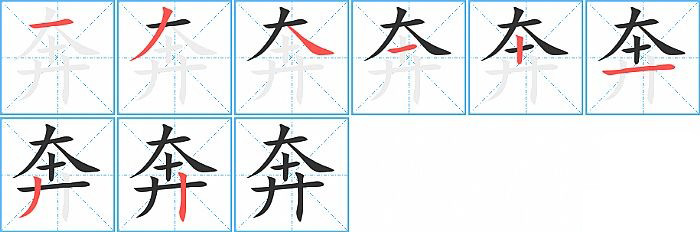 1. 急走,跑:奔跑。奔驰。奔突(横冲直撞;奔驰)。奔流。奔腾。奔忙。奔波(劳苦奔走)。奔放(疾驰。喻气势雄伟,不受拘束)。私奔(女子私自投奔所爱的人,或跟他一起逃走)。