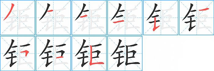 - 问:写"钜"字第8笔是什么笔画?答:横【