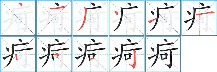 - 问:写"疴"字第10笔是什么笔画?答:竖钩【