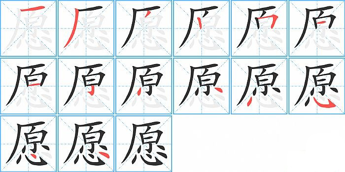 - 问:写"愿"字第12笔是什么笔画?答:斜钩【
