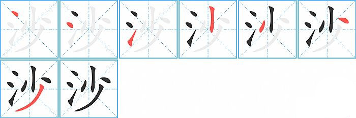 1. 非常细碎的石粒:沙子。沙石。风沙。沙尘。沙砾(沙和碎石块)。沙漠。沙丘。沙滩。沙洲(江河里由泥沙淤积成的陆地)。沙暴。沙浴。沙疗。沙鸥(文学上指栖息岸边沙地的鸥一类的水鸟)。