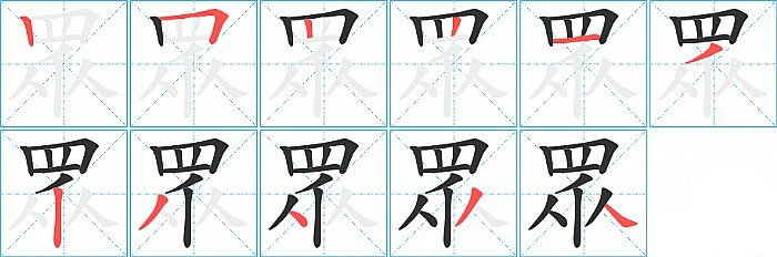- 问:写"眾"字第10笔是什么笔画?答:撇【
