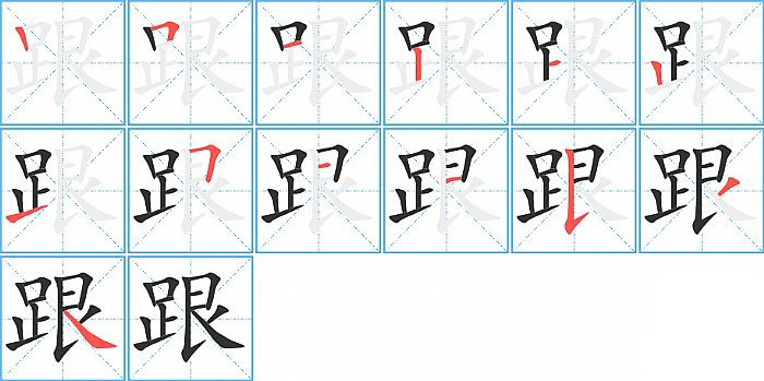 - 问:写"跟"字第13笔是什么笔画?答:捺【