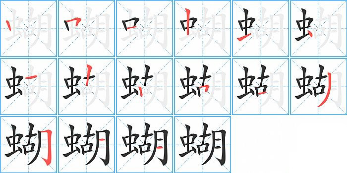 - 问:写"蝴"字第12笔是什么笔画?答:撇【