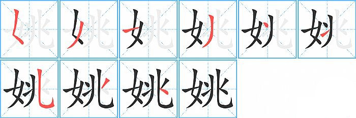 撇点、撇、横、撇、点、提、竖弯钩、撇、点