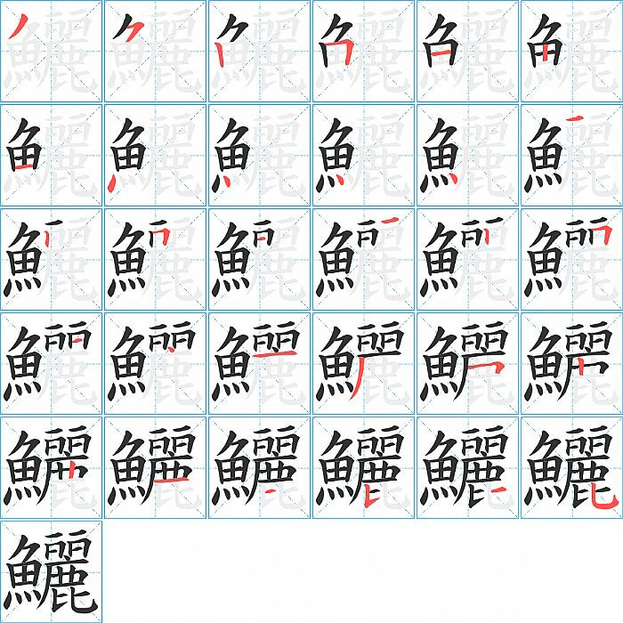鱺的笔画为30画, 笔顺为。鱺的书写口诀撇、横撇/横钩、竖、横折、横、竖、横、点、点、点、点、横、竖、横折、点、横、竖、横折、点、点、横、撇、横折、竖、竖、横、横、竖提、撇、竖弯钩。