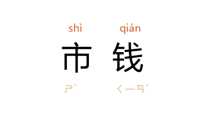 ⒉ 市制重量单位。一市钱等于百分之一市斤,合公制五克。旧制等于一百六十分之一市斤。通称钱。