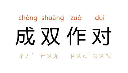 亦作“成双成对”。 《儿女英雄传》第二六回:“讲到姐姐今日这喜事,不但有媒有妁,并且还请得是成双成对的媒妁,餘外更多着一位月下老人。”