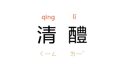 引《周礼·天官·浆人》:“共夫人致饮於宾客之礼,清醴医酏糟而奉之。”郑玄 注:“饮醴,用柶者糟也;不用柶者清也。”三国 魏 曹植 《侍太子坐》诗:“清醴盈金觴,殽饌纵横陈。”晋 潘尼 《琉璃碗赋》:“流景烱晃以内澈,清醴瑶琰而外见。”宋 范成大 《望海亭赋》:“属紫霄之妙质,侑玉斝之清醴。”