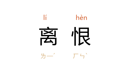 引南朝 梁 吴均 《陌上桑》诗:“故人寧知此,离恨煎人肠。”南唐 李煜 《清平乐》词:“离恨恰如春草,更行更远还生。”《儿女英雄传》第二一回:“把这一腔离恨,哭个痛快。”李大钊 《送别幼衡》诗:“壮别天涯未许愁,尽将离恨付东流。”