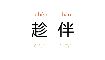 引唐 白居易 《初到洛下闲游》诗:“趁伴入朝应老丑,寻春放醉尚粗豪。”唐 李屿 《过洞庭》诗:“渐落分行雁,旋添趁伴舟。”宋 苏舜钦 《重过句章郡》诗:“窥鱼翠碧忘形坐,趁伴蜻蜓照影飞。”