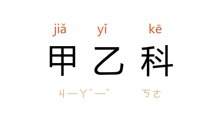 引唐 萧颖士 《送张翚下第归江东》诗:“地尽东南美,朝遗甲乙科。”宋 王谠 《唐语林·企羡》:“崔起居 雍 ……兄 明、序、福,兄弟八人皆进士,列甲乙科。”清 方苞 《陈依宣墓志铭》:“﹝ 依宣 ﹞教授数十年,生徒半庠序,多登甲乙科,而君卒不第。”
