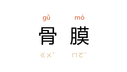 ⒈ 骨头表面的一层薄膜,质地坚韧,由结构组织构成,含有大量的血管和神经。骨细胞的营养靠骨膜供给。