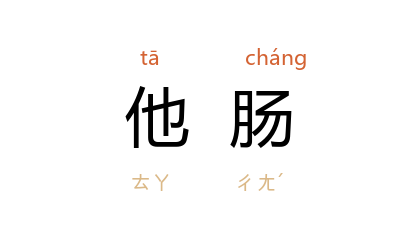 引《史记·万石张叔列传》:“﹝ 卫綰 ﹞有功,常让他将。上以为廉,忠实无他肠,乃拜 綰 为 河间王 太傅。”唐 李肇 《唐国史补》卷上:“安禄山 恩宠寖深,上前应对,杂以谐謔,而贵妃常在坐……虽 林甫 养有之,而 国忠 激怒之,然其他肠有所自也。”清 戴名世 《先大人诗序》:“先君为人醇厚忠谨,无他肠,顾内自忧思刻苦,竟以终其身。”