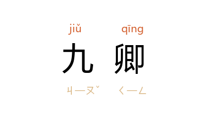 ⒈ 周代称少师、少傅、少保、冢宰、司徒、宗伯、司马、司寇、司空为「九卿」。后用以指中央的九等高级官职,唯历代名称多所变更。
