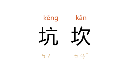 引《三国演义》第五十回:“军士曰:‘小路投 华容道,却近五十餘里,只是地窄路险,坑坎难行。’”清 戴名世 《与赵良冶书》:“蹀躞於坑坎之途,驰骤於污泥之阪,则其害岂特颠仆而已哉!”