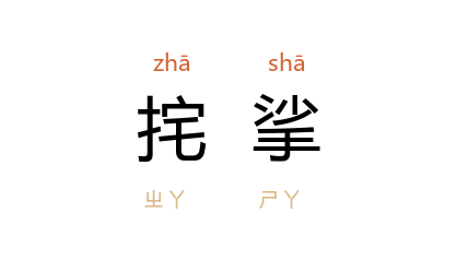 引《集韵·平麻》:“挓,挓挱,开貌。”郭澄清 《大刀记》第二十章:“小勇 一见 志勇 的面,就把扛在肩上的红缨枪一扔,挓挲着胳膊扑过来。”
