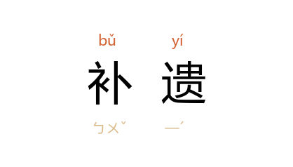 ⒈ 书籍正文还有遗漏,列在后面另加说明,称为「补遗」。或将原书遗漏的部分另作专册,也称为「补遗」。如阮元的《三家诗补遗》。