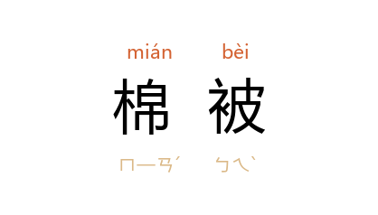 ⒈ 用棉花为心、棉布或其他质料包在外面的被子。