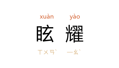 眩燿:1.光彩夺目;闪耀。眩,通“炫”。 《楚辞·刘向<九叹·惜贤>》:“扬精华以眩燿兮,芳鬱渥而纯美。”