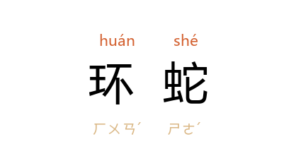 ⒈ 环蛇属( Bungarus )的几种生有鲜明圈环,虽不爱寻衅但却极毒的夜行性眼镜蛇型蛇的任一种,土生于东亚及其附近岛屿上,常出现于耕地和居民点附近,特别爱吃其他种蛇。著名的两种环蛇是金环蛇( B.fasciatus )和银环蛇(B.multicinctus),中国南方各省都有。