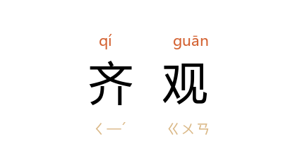 引明 陈子龙 《偕熊令君伯甘游乌伤云黄山》诗:“和絃愧同调,击壤庶齐观。”罗惇曧 《文学源流·附论杨子》:“此其生死齐观,不为世缚,可谓坦然自适者矣。”鲁迅 《坟·论“费厄泼赖”应该缓行》:“而于狗,却不能引此为例,与对等的敌手齐观,因为无论它怎样狂嗥,其实并不解什么‘道义’。”