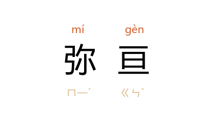 引《后汉书·马防传》:“又大起第观,连阁临道,弥亘道路。”《旧唐书·德宗纪上》:“自顷以来,灾沴仍集,雨泽不降,绵歷三时,虫蝗继增,弥亘千里。”宋 陈亮 《酌古论·刘备》:“或出 皖城,或出 广陵,东西弥亘,直造 长江,因 蜀 之势,大举攻 吴。”清 周亮工 《书影》卷四:“若九春三秋,天景清丽,必有素雾自岊起,须臾粉堞青甃,弥亘数里。”