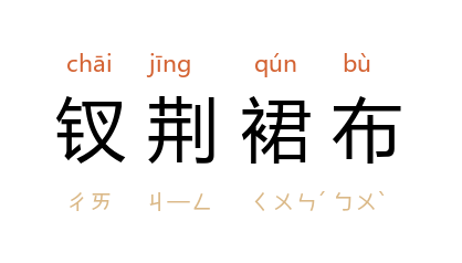 引语出《太平御览》卷七一八引 汉 刘向 《列女传》:“梁鸿 妻 孟光,荆釵布裙。”《红楼梦》第五七回:“因 薛姨妈 看见 邢岫烟 生得端雅稳重,且家道贫寒,是个釵荆裙布的女儿,便欲説给 薛蟠 为妻。”