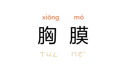 ⒈ 覆盖在胸腔内壁及肺脏的膜。覆盖于肺脏的部分称为「肺胸膜」,覆盖于胸壁与横膈的部分称为「壁胸膜」。就正常人而言,此两部分必相接触,并与肺根部相接合。胸膜可渗出稀薄的液体,保持其表面的潮湿及润滑,以减少两层薄膜间的摩擦。