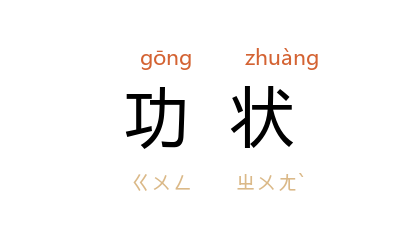 引《三国志·吴志·孙坚传》:“刺史 臧旻 列上功状,詔书除 坚盐瀆 丞。”《新五代史·杂传·段凝》:“凝 与 彦章 各自上其功, 巖 从中匿 彦章 功状,悉归其功於 凝。”元 揭傒斯 《重建济州会源牐碑》:“明年春二月,具功状,遣其属 孟思敬,至京师请文勒石。”
