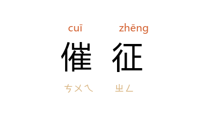 引宋 乐史 《太平寰宇记·岭南道十二·智州》:“管 文、兰、镇寧、抚水 等四州最偏僻远者。所入赋租, 宜州 差人去催徵。”《明史·食货志二》:“既而諭德 顾鼎臣 上钱粮积弊四事:一曰察理田粮旧额……二曰催徵岁办钱粮。”清 黄六鸿 《福惠全书·钱穀·总论》:“夫有司之职,大要钱穀为重。而钱穀之重祗在催徵、比较、拆贮、解给与漕项收兑数者而已。”