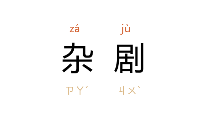 ⒈ 一种戏曲。原为宋代以滑稽方式表演的戏,至元代则指以北曲为主干的戏剧。通常分为四折,有的则依剧情在开头或两折之间加楔子,每折用同一宫调及同一个韵,由一个脚色独唱,其他脚色则用道白。