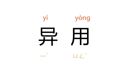 引管子 任法以治 齐 而天下称仁焉,是法与礼乐,异用而同功也?”晋 葛洪 《抱朴子·喻蔽》:“五材并生而异用,百药杂秀而殊治。”章炳麟 《文学说例》:“辞气不殊,名物异用,於是乎辞例尚焉。”