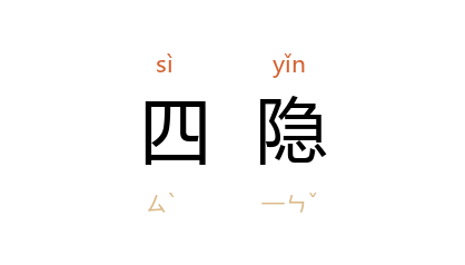 ⒈ 旧指交友、故旧、邑里、门郭四种关系的人,此四者相互隐恶扬善,故称四隐。《吕氏春秋·论人》:“论人者,又必以六戚、四隐。何谓六戚?父、母、兄、弟、妻、子;何谓四隐?交友、故旧、邑里、门郭。”高诱注:“四隐,相隐而扬长蔽短也。”一说指赖以凭依的四者。陈奇猷校释:“交友、故旧、邑里、门郭皆借以依凭者,故谓之'四隐'。高注不洽。”按,依陈说,隐则读yìn。