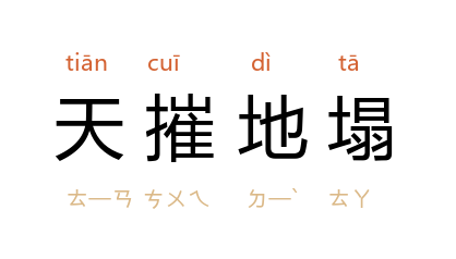 引《三国演义·第五回》:「众诸侯听得关外鼓声大振,喊声大举,如天摧地塌,岳撼山崩,众皆失惊。」《东周列国志·第五四回》:「楚兵人人耀武,个个扬威,分明似海啸山崩,天摧地塌。」