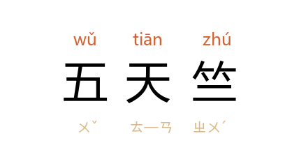 引清 魏源 《圣武记》卷五:“﹝ 西藏 ﹞在 五天竺 之东,非古佛国也。”亦省作“五天”。 唐 王维 《能禅师碑》:“大师至性淳一,天姿贞素……故能 五天 重跡,百 越 稽首。”宋 林逋 《诗魔》诗:“此魔降不得,珎重 五天 人。”