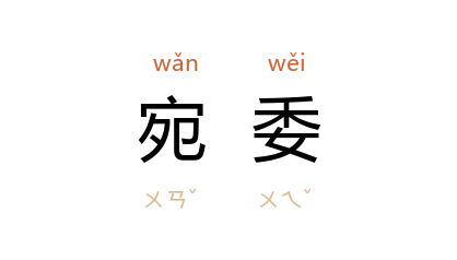 ⒈ 弯曲;曲折。宛转委曲。即宛委山。传说禹登宛委山得金简玉字之书,因以借喻书文之珍贵难得。如清·阮元所辑丛书名《宛委别藏》,即取意于此。