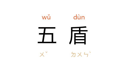 引《周礼·夏官·司兵》:“司兵,掌五兵五盾。”郑玄 注:“五盾,干櫓之属,其名未尽闻也。”《元史·舆服志二》:“前井宿旗左,参宿旗右,各五盾从。次鬼宿旗左,觜宿旗右,各五弓从。次柳宿旗左,毕宿旗右,各五盾从。”