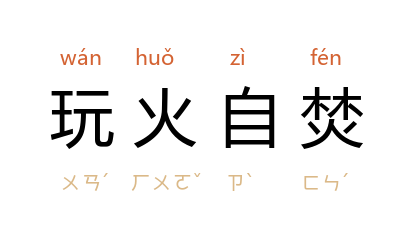 ⒈ 后以“玩火自焚”比喻冒险干坏事的人必将自食其恶果。后以“玩火自焚”比喻冒险干坏事的人必将自食其恶果。