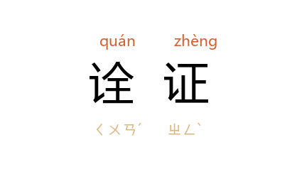 引《孝经·圣治》“夫圣人之德又何以加於孝乎” 宋 邢昺 疏:“孔圣 垂文,固非臆説,前儒詮证,各擅一家。”张纯一 《<晏子春秋校注>凡例》:“至诸书詮证,於《晏子》恉趣间有未彻,或不切要者,概不辑録。”