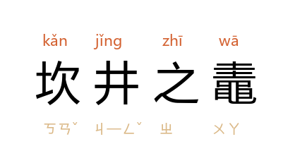 ⒉ 浅井里的青蛙。《庄子·秋水》:“子独不闻夫坎井之蛙乎?谓东海之鳖曰:'吾乐与!出跳梁乎井干之上……且夫擅一壑之水,而跨跱坎井之乐,此亦至矣,夫子奚不时来入观乎!'”后因以比喻见识短浅。