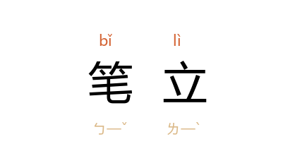 引郑振铎 《取火者的逮捕》二:“他向侍立的权威和势力瞬了一眼,他们正铁棒似的笔立着待命。”徐迟 《三峡记》:“因为崖岸笔立,险峻、嶙峋的石壁上找不到一块可以平放三角架的地方。”《人民文学》1977年第7期:“环行路上的华灯,如亭亭笔立的玉树。”