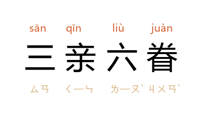 引元 关汉卿 《鲁斋郎》第一折:“那里管三亲六眷。”亦作“三亲四眷”。 《警世通言·赵春儿重旺曹家庄》:“次日真个到三亲四眷家去了一巡。”