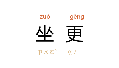引《清史稿·职官志五》“弘德殿”原注:“兼 凤彩门。侍监首领各二人,专司陈设氾埽,御前坐更。故事内廷重坐更。”《红楼梦》第六三回:“那天已是四更天气,坐更的闻知,忙喝起众人来。”倪志亮 《三战三捷》:“﹝他们﹞白天挖壕,晚上坐更,赶筑工事,只求保命。”
