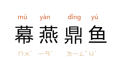 ⒈ 幕燕,筑巢于帷幕上的燕子。鼎鱼,游于炊器中的鱼。幕燕鼎鱼比喻处在极度危险当中。
